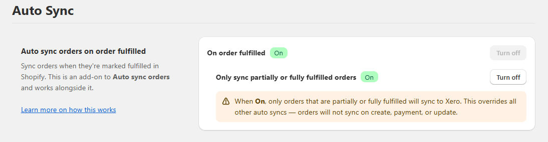 This overrides all other auto-sync functionality, meaning orders will only sync to Xero when they are partially or fully fulfilled. Orders will not sync when they are created, paid, or updated.