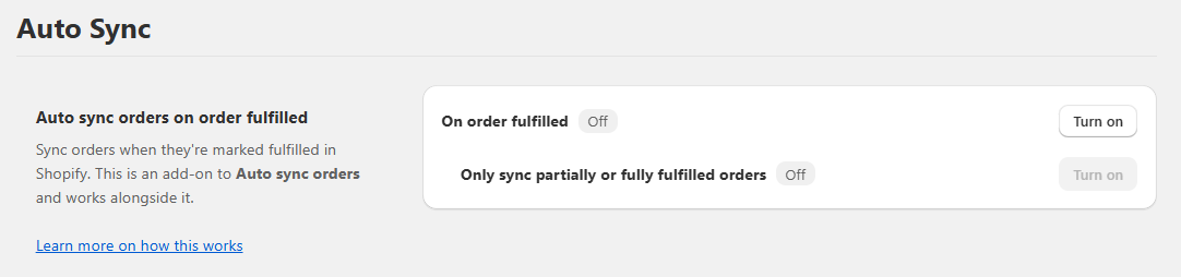 This setting works alongside your default Auto sync choice. It does not replace the default behaviour; it simply adds fulfilment as another trigger for syncing.