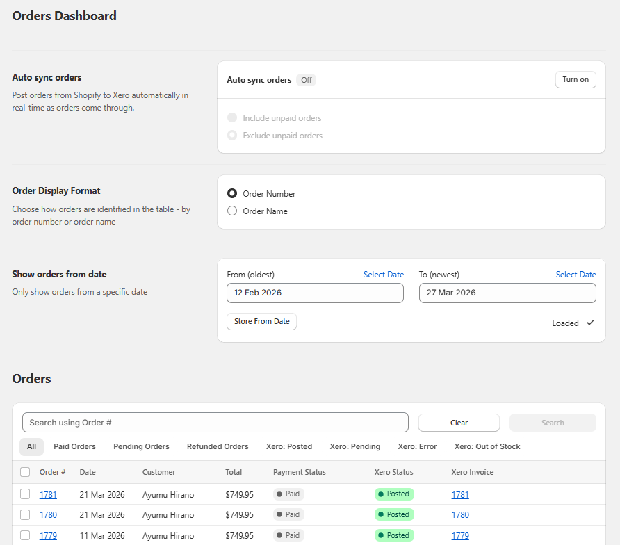 Tip: If this is your first time using Post to Xero, leave auto-sync off and manually post the first order from the Orders Dashboard. Then check Xero to make sure everything looks right. Once you’re happy, you can enable auto-sync.