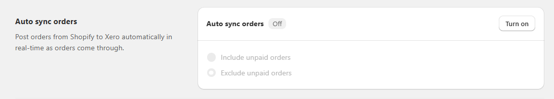 What it does: Turn this on to automatically sync new Shopify orders to Xero as they are created. When enabled, orders are posted automatically without manual posting required.